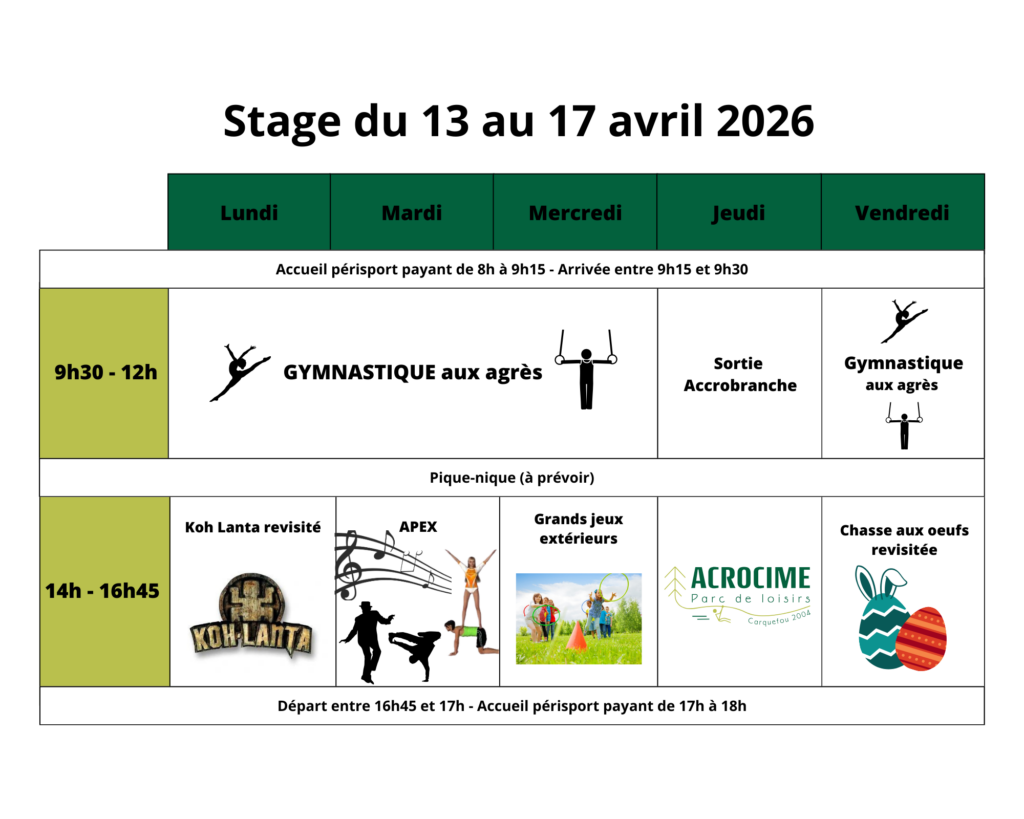 Inscriptions en ligne : https://www.helloasso.com/associations/elan-2000-gym/adhesions/stage-gym-avril-13-au-17-avril-2026