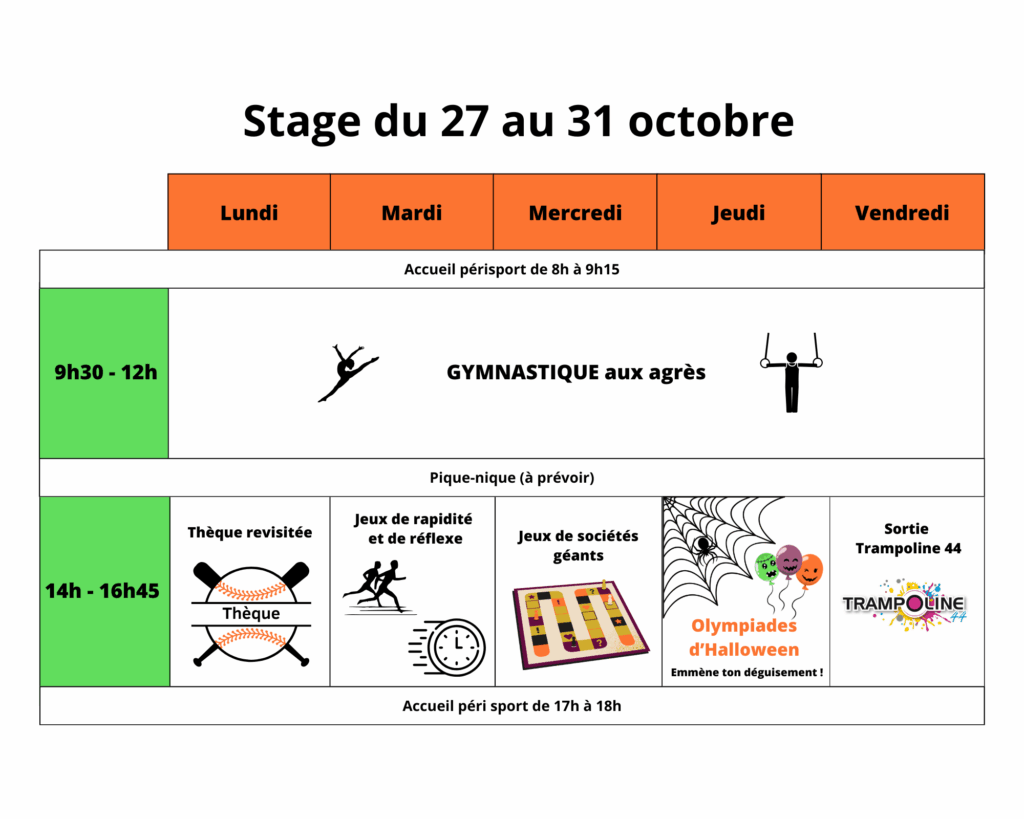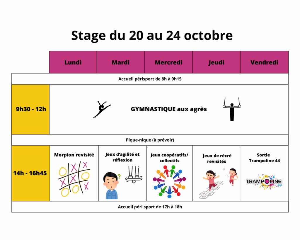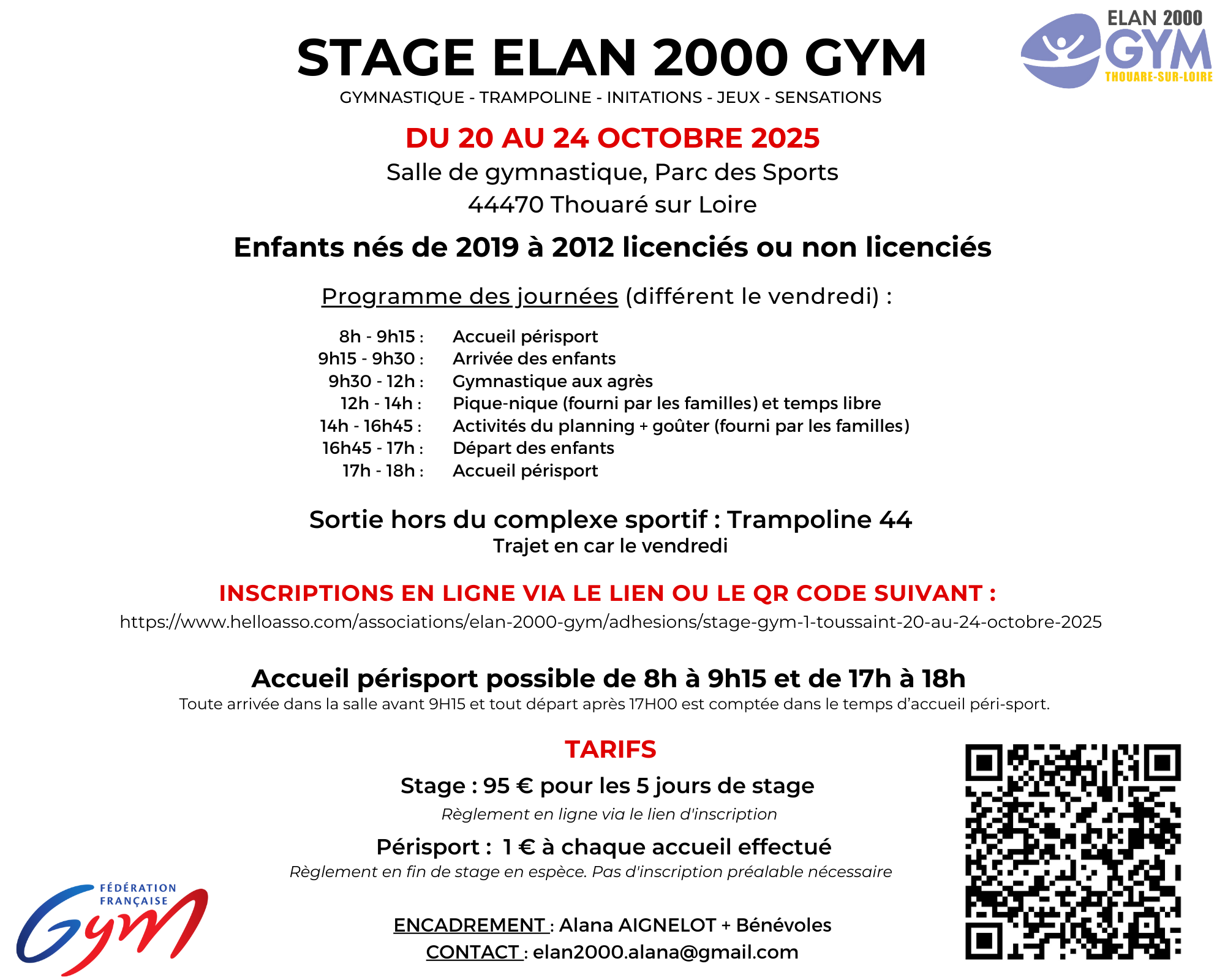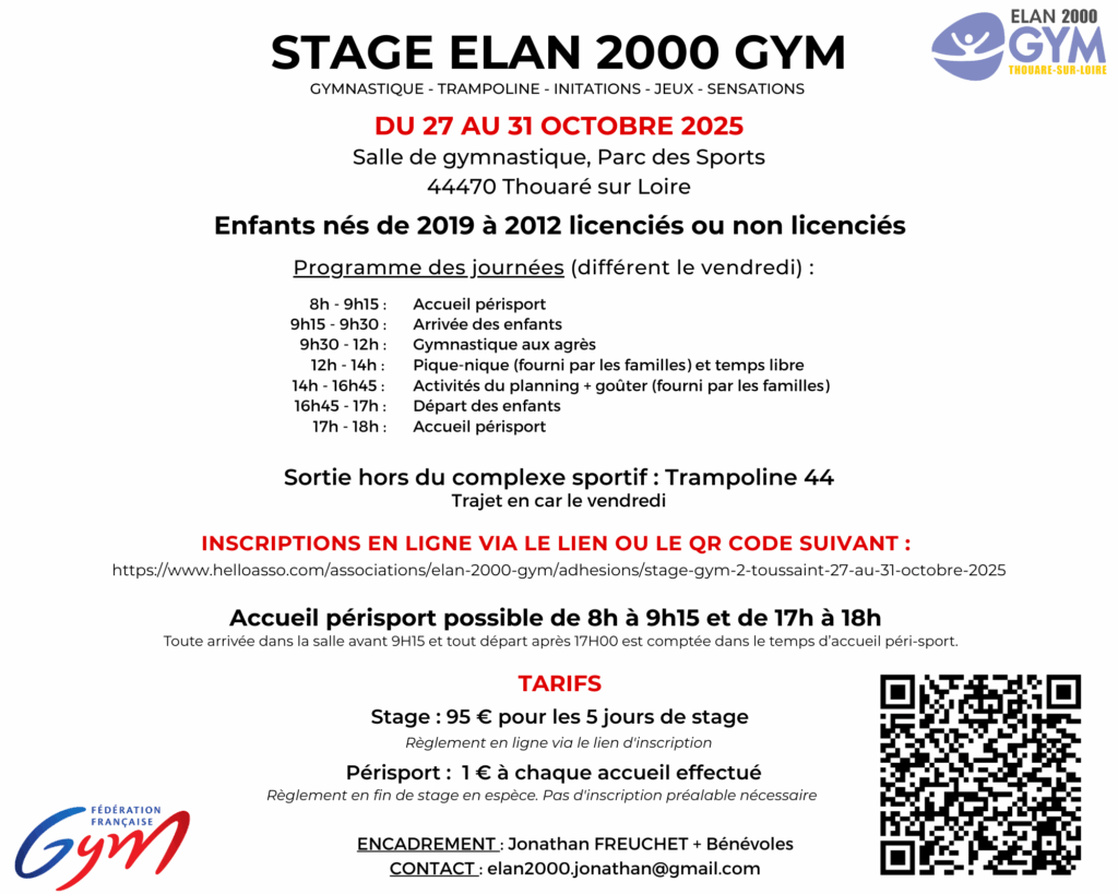 Inscriptions en ligne : https://www.helloasso.com/associations/elan-2000-gym/adhesions/stage-gym-1-toussaint-20-au-24-octobre-2025